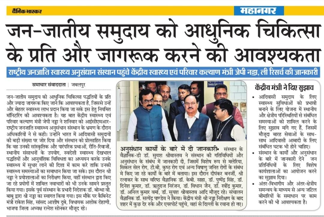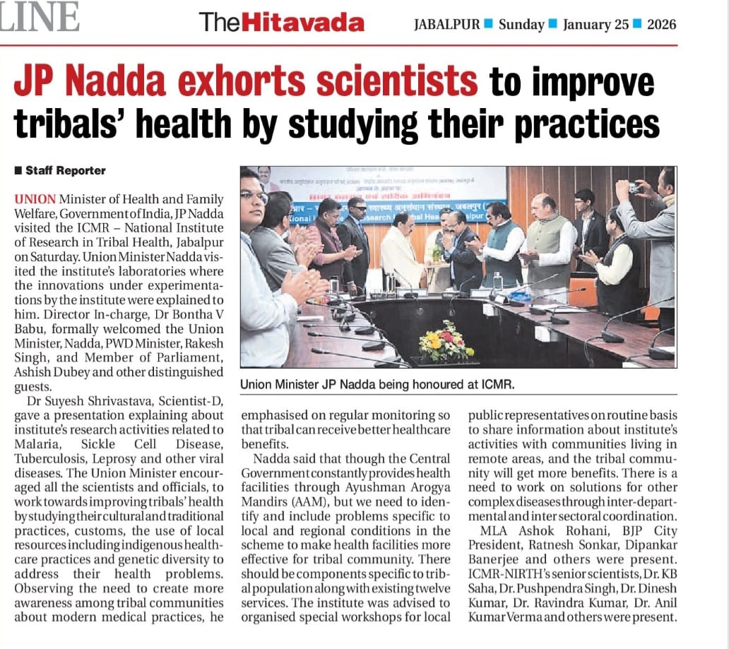 Union Health Minister Shri J.P. Nadda urges scientists and researchers to improve tribal health outcomes by studying indigenous practices, traditions, genetic diversity and local healthcare systems during his visit to ICMR–national institute of research in tribal health, jabalpur (date: 24/01/2026)
